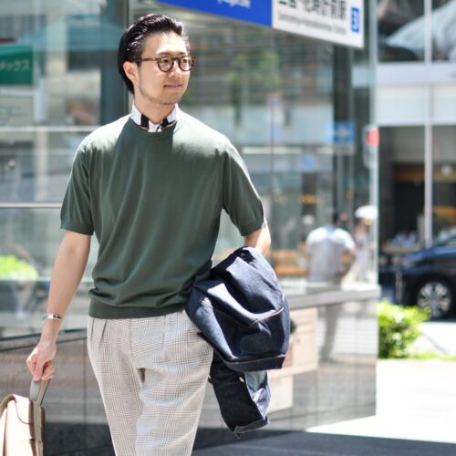 カーキに馴染むベージュのグレンチェックをチョイス。