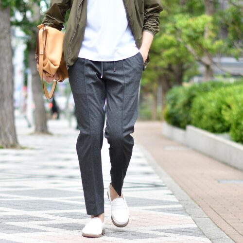 パンツにはチャコールグレーのジャージーを合わせて