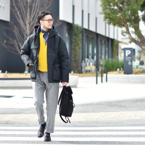 最後はスカーフを巻いてアウターのアクティブな印象を
