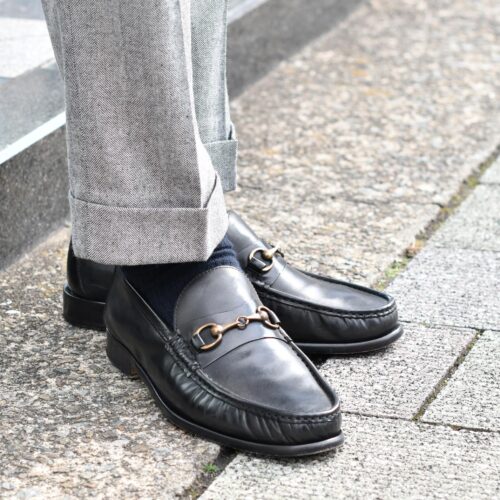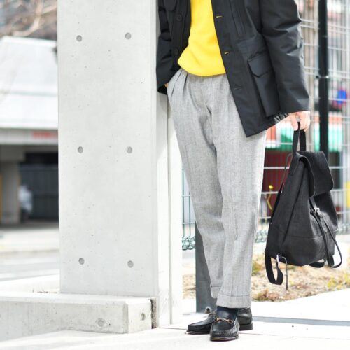 パンツはニットの英国つながりでヘリンボーン生地をチョイス。