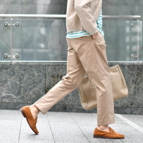 チノスラックスを合わせてカジュアルに。