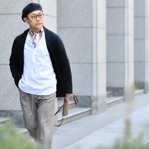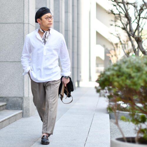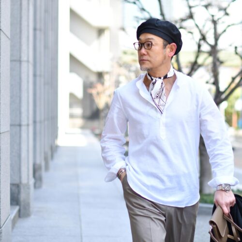 バンドカラーの軽快な襟元は、シャツであってもまるでカットソーの様に