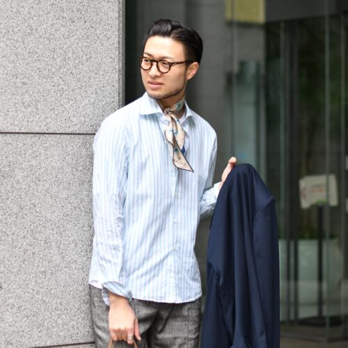 アクセントとしてインナーにGiannettoのグリーンのストライプシャツを合わせております。
