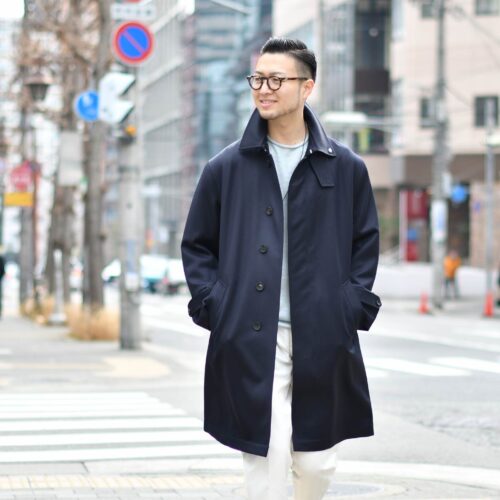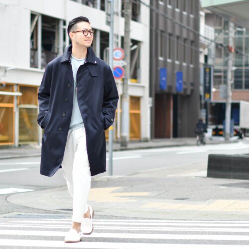 ネイビーのステンカラーコートで少しまじめな雰囲気もプラスしています。