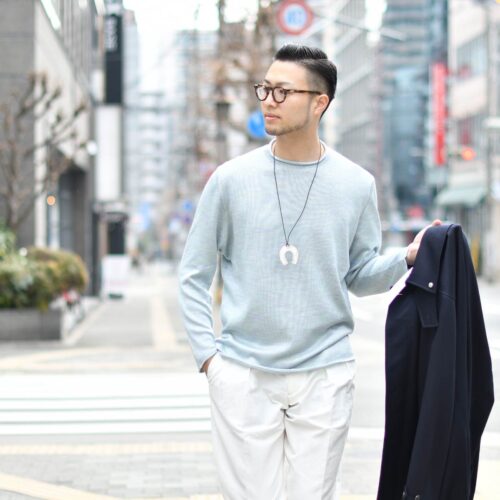 本日ご紹介致しますのは爽やかニットを使用したコーディネート。