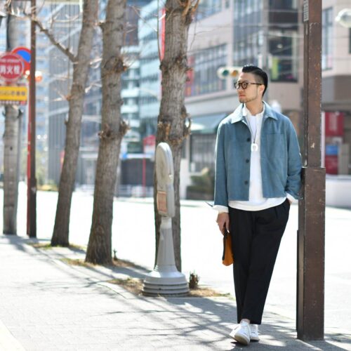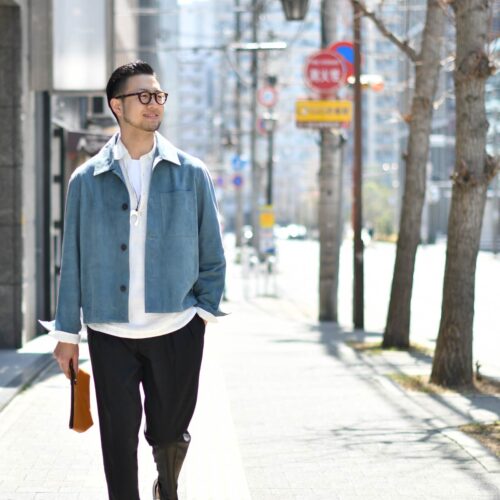 ARMA【アルマ】のブルーレザーのブルゾンを使用したコーディネイト。