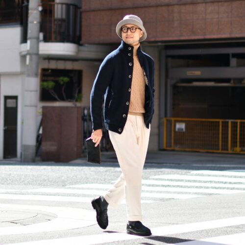 アウターのネイビーに対しベージュ系ニット、パンツで定番のイタリア的な組み合わせ☆