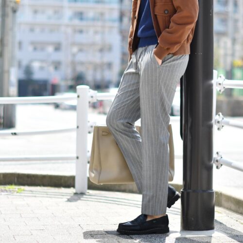 グレーストライプのパンツで英国トラッドな香りも少し漂わせつつ