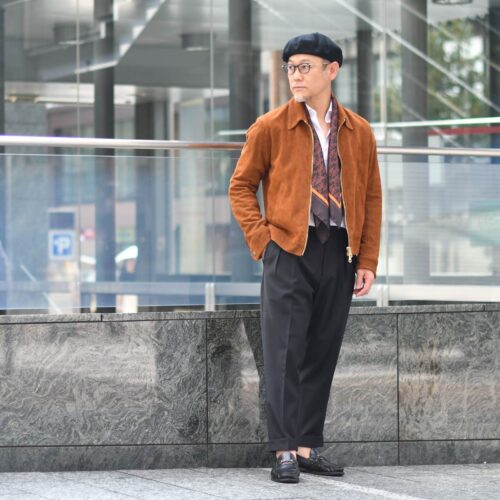 ブラウンスエードには、ネイビーやグレーのパンツをコーディネートするのが