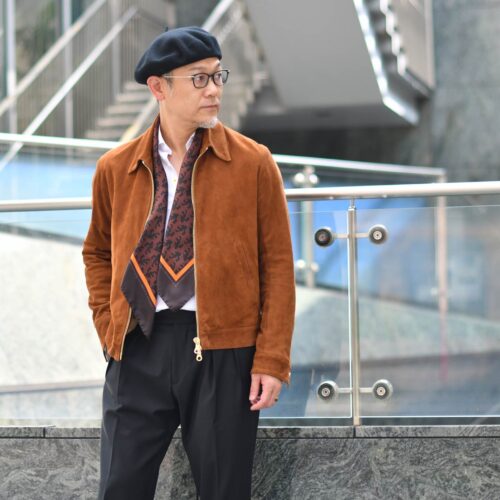 襟付きライダースブルゾンは、限界まで薄く仕上げた0.4㎜の極薄ゴートスエード。