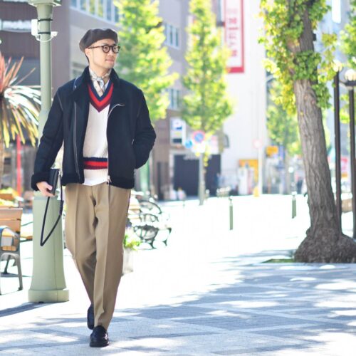パンツはワイドテーパードのパンツを合わせてリラックスしたスタイリングの完成です。