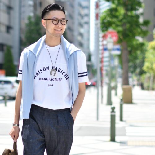 白Tに優しく映えるパウダーブルーが本当にきれいです。