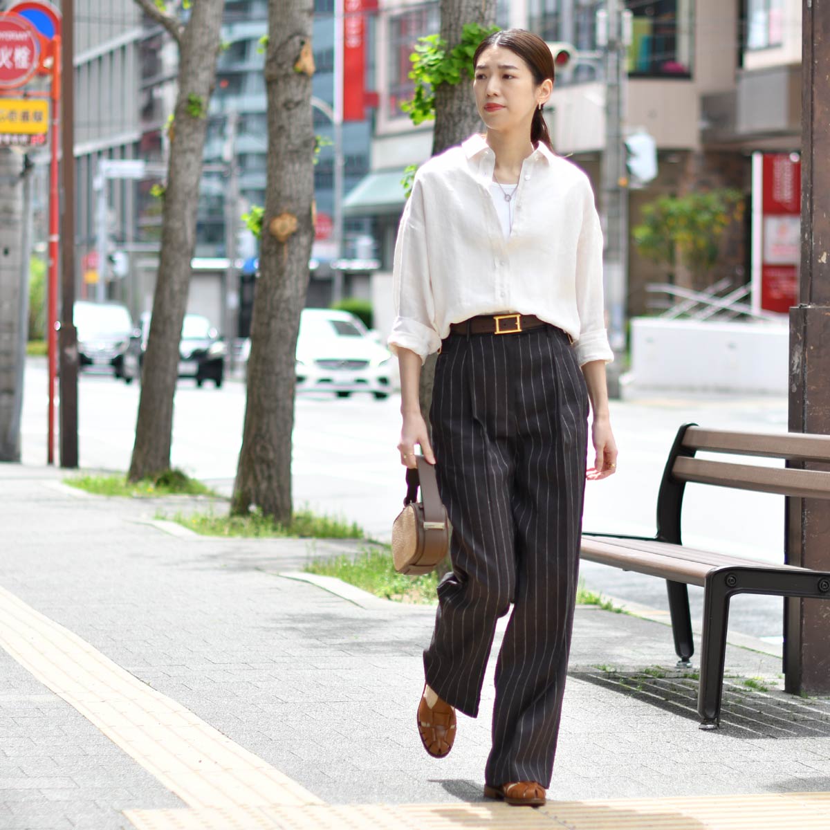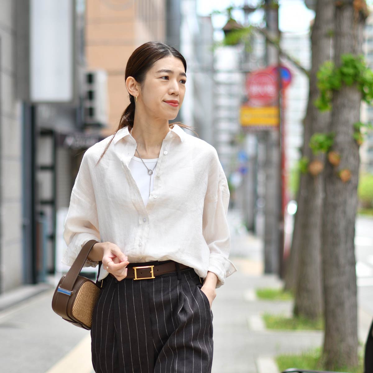 トップスには、顔映りの良いFinamoreの淡いベージュリネンシャツを合わせました。