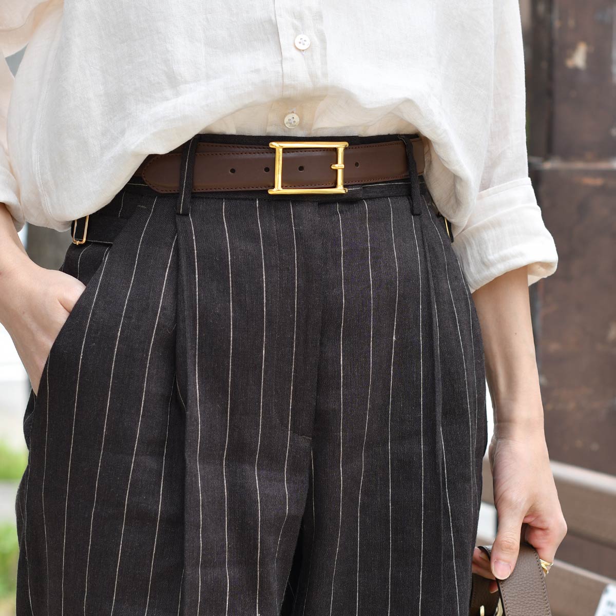 仕上げにゴールドバックルのベルトでウエストをマークすれば、