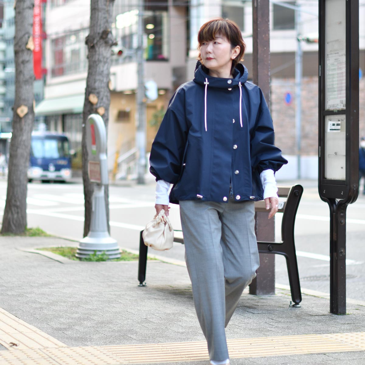 ボトムには、グレーのパンツで都会的に。