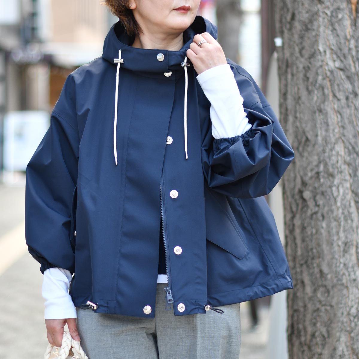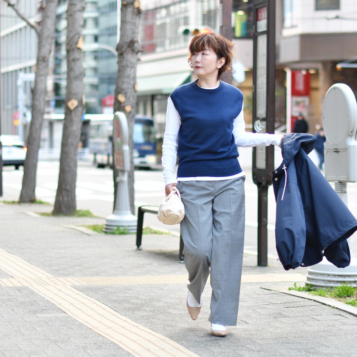 春先にネイビーアウターだと、重たく感じるかも。。