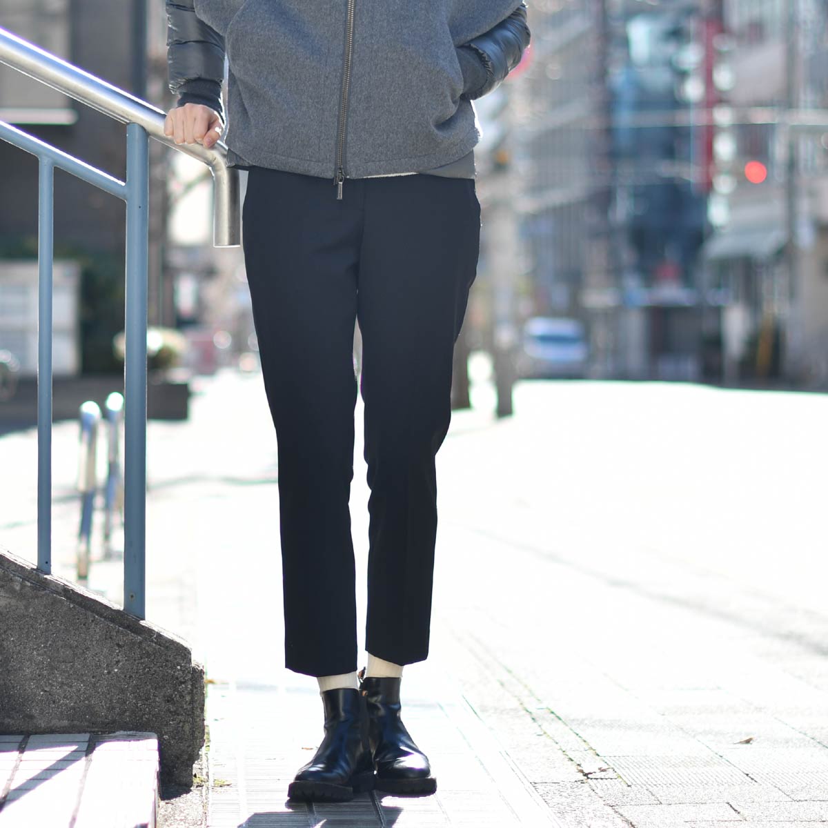 ボトムスには、シルエットの美しさに定評があるPT TORINOの「HOLLY」をセレクトしました。足元はチェルシーブーツで引き締め、チラリと覗くソックスでアクセントを。