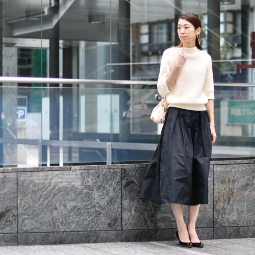 ブラックのフワッと広がるタフタ素材のINCOTEXのスカートをスタイリング!