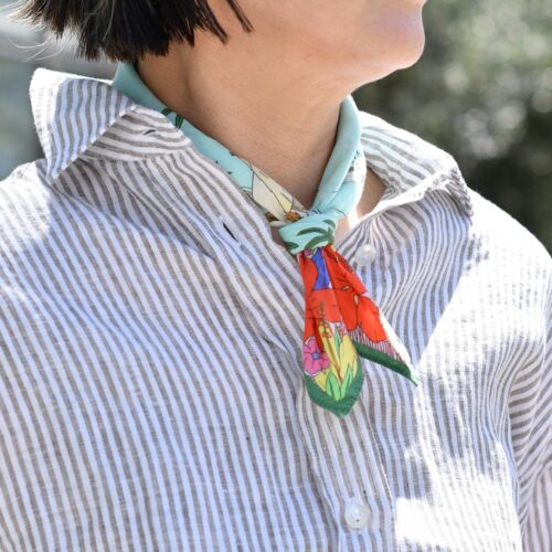 Dieffe Kinlochのプリントハンカチをバンダナ風に首元に巻いていただきますと