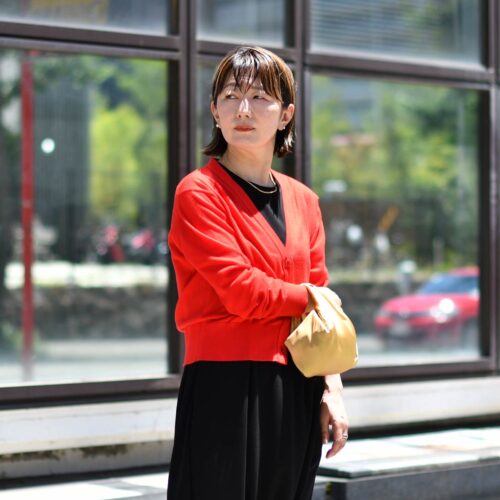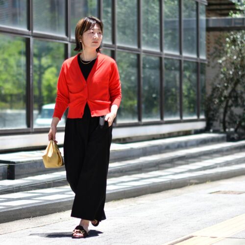 羽織りには、JOHN SMEDLEYの短め丈のカーディガンがバランスよく。