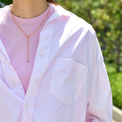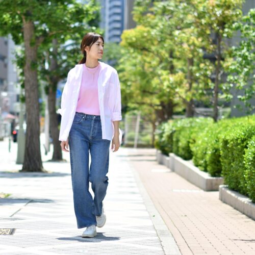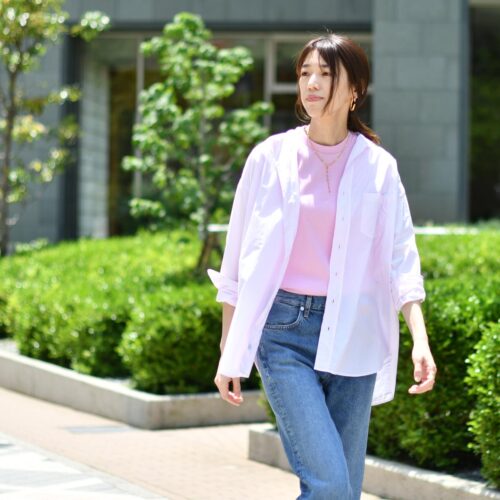 そこに、イチゴミルクの様な綺麗なピンクのカットソーを合わせて