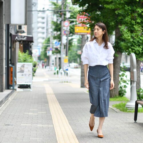 INCOTEXのボックスプリーツのスカートとスタイリング致しました。