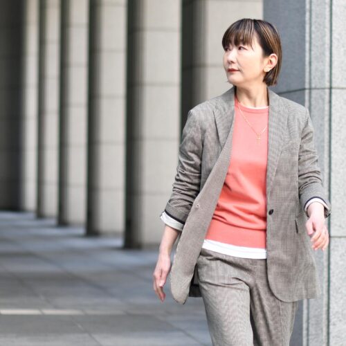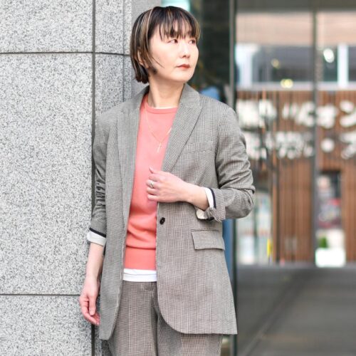 クラシックな千鳥柄プリントのインナーには、差し色コーラルピンクで春らしく。