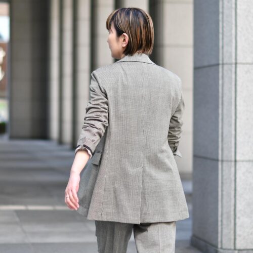 セットアップスーツとして着用しても、ほんのり抜け感漂うデザインです。