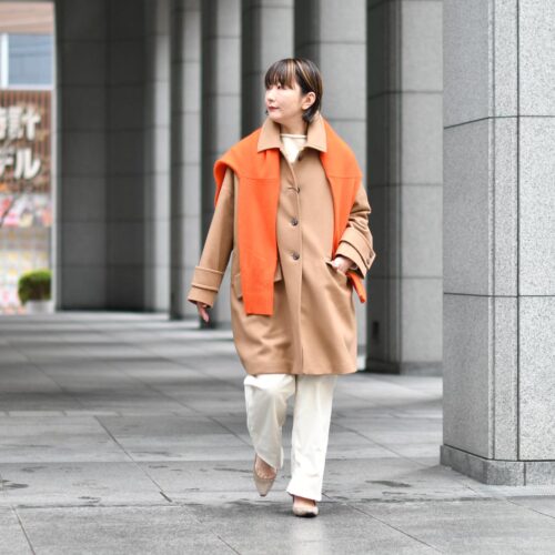 肩掛けしたオレンジカーディガンは、