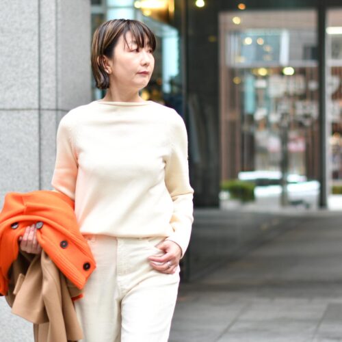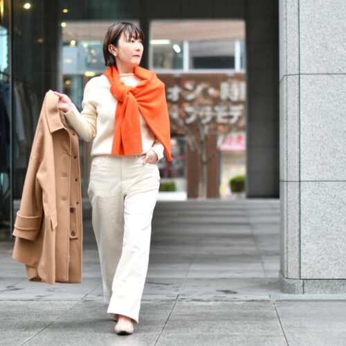 温かみのあるクリームホワイトのニット×パンツですので