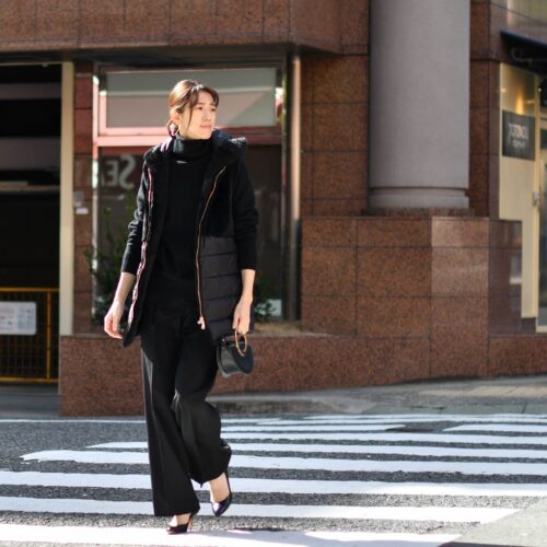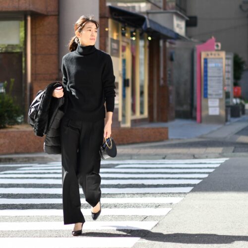 パンプス合わせのオールブラックにすると一気にエレガントなスタイルにもマッチ致します。