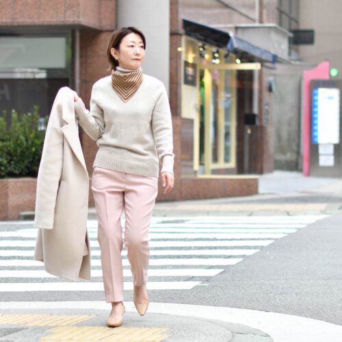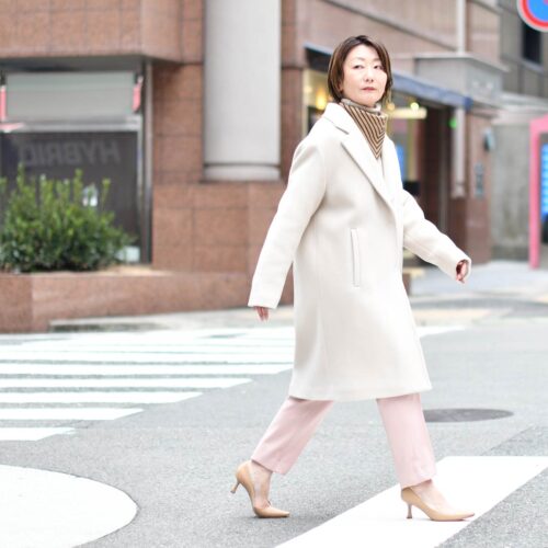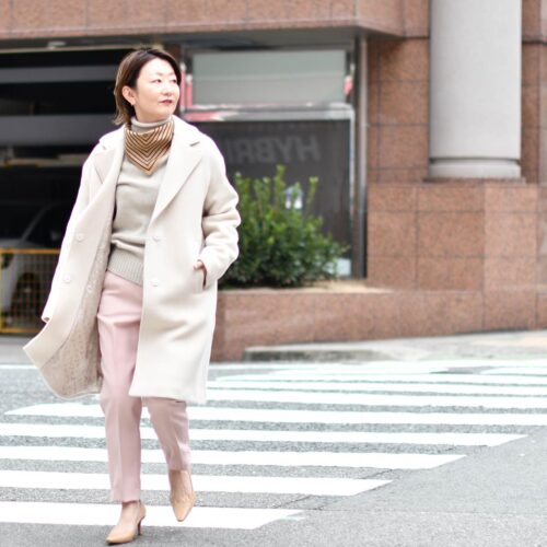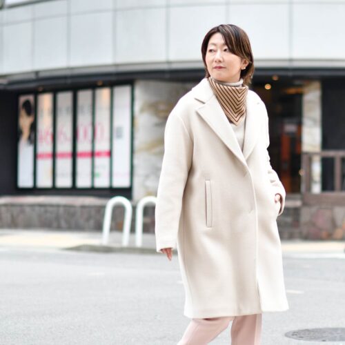 カッコ良くもあり、女性らしさもあるコートスタイル。
