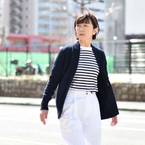 ボーダーニットにホワイトパンツの爽やかマリンスタイルの羽織りとしても◎