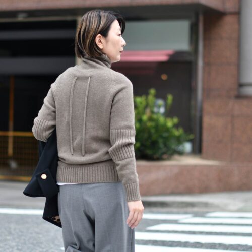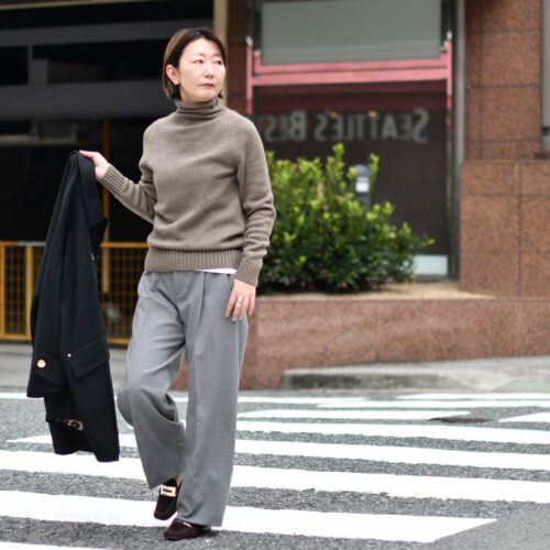 グレー味を帯びたブラウンカラーのニットにトーンを合わせ