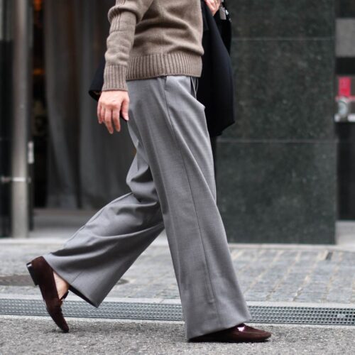 ライトグレーのパンツとブラウンのローファーをセレクト。