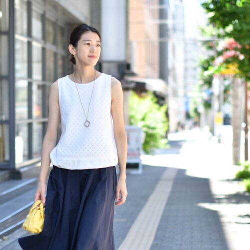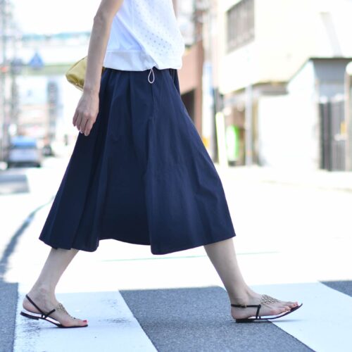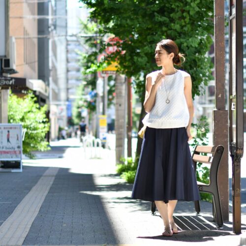 ボトムスは、体感的にも涼しいネイビーのフレアースカート。