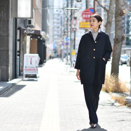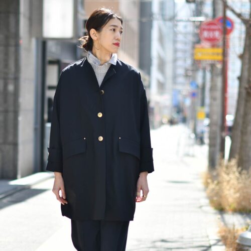 ゴールドボタンが華やかなMACKINTOSHのノーカラーコート。