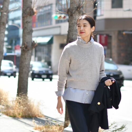 インナーはローゲージのクルーネックニットをシャツとレイヤードし、