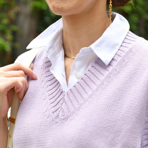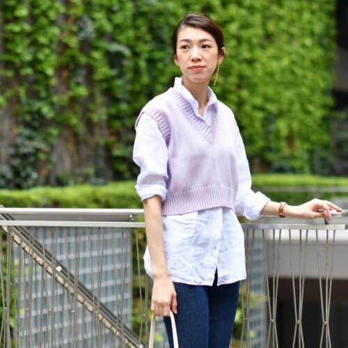今シーズン注目のショート丈のニットをベストとしてシャツとレイヤード。