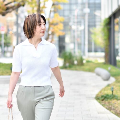 グリーンが映えるようにトップスには白のニットを合わせました。