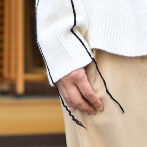 ホワイトニットに、コントラストを付けてくれる黒ステッチが