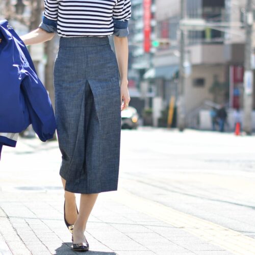 ボトムスはボックスプリーツのスカートが上品なトラッド感を演出いたします。