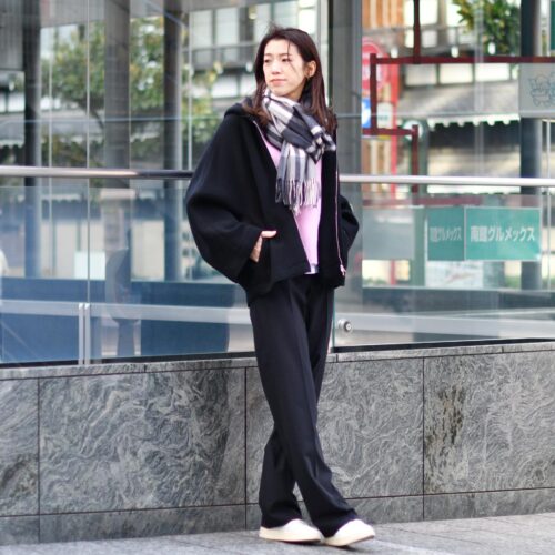 ゆったりとした身頃、裾は身体に沿うようなコクーンシルエットで