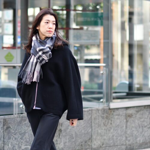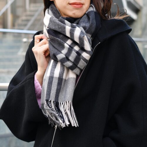 チェック柄のストールとピンクのニットでアクセントをプラス。