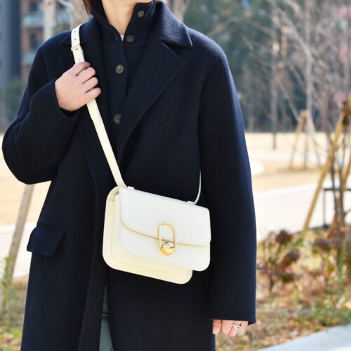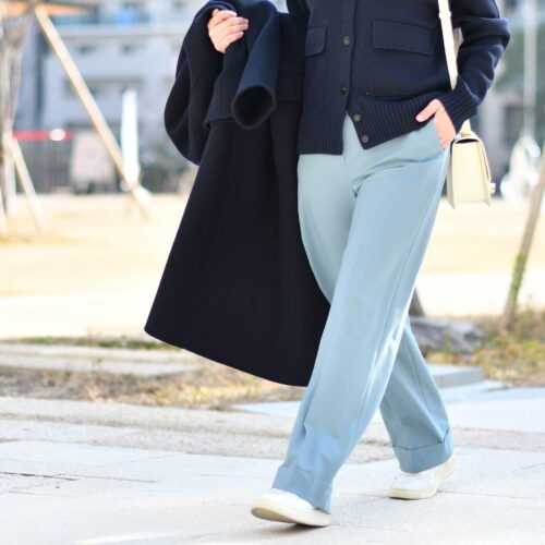 ブルーのパンツやアイボリーのバッグが効いてきます。