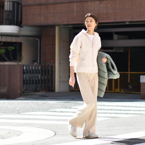 インナーはアイボリーのパーカー×アイボリーのワイドパンツで