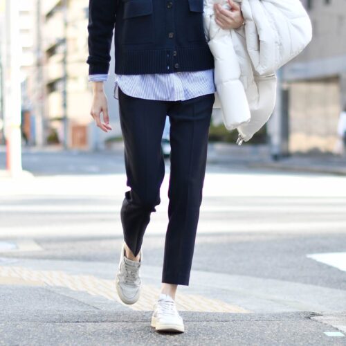 スッキリとテーパードパンツをボトムスに、