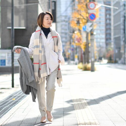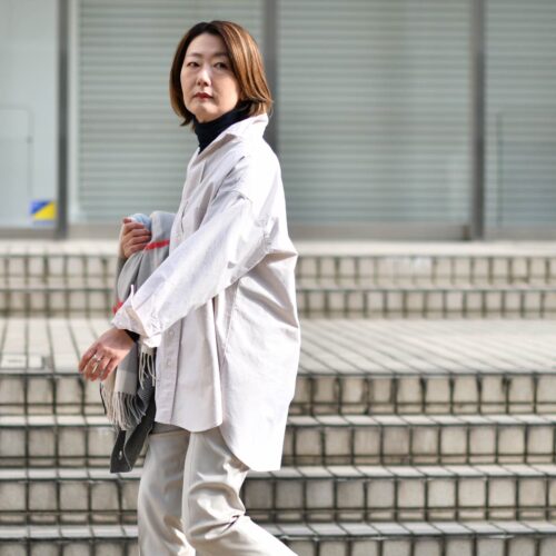 本日は、ニュアンスカラーのシャツを間に差し込み都会的にスタイリング。