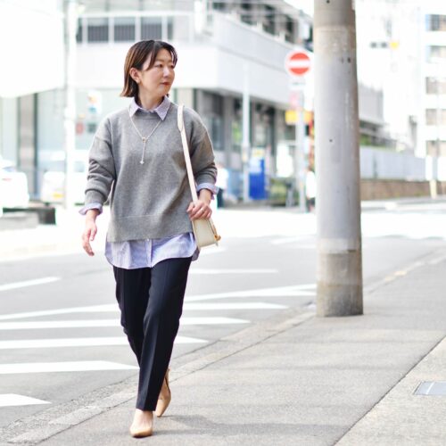 グレーニットのふんわりとした雰囲気もストライプシャツをインすることで
