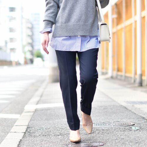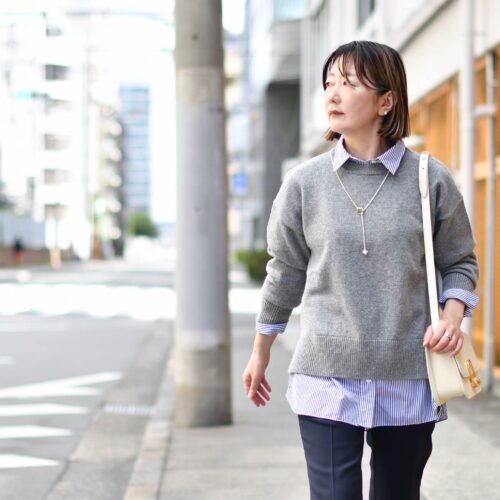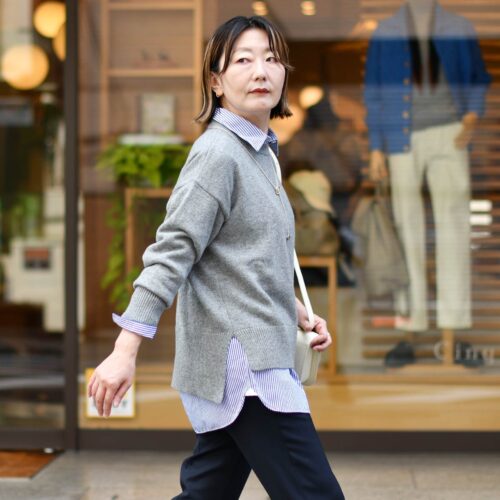 また、ニットからのぞくシャツの丈バランスも絶妙です。